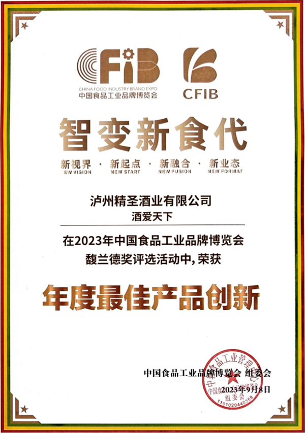 瀘州精圣酒業(yè)有限公司出品的“精圣”牌酒愛天下·禮品酒,具有諸香渾然添陳、內(nèi)斂渾厚飽滿、韻味甘綿雅凈,聞著香、喝著順、飲后心曠神怡的內(nèi)在品質(zhì),以及銀裝素雅剔透、生態(tài)玉白韻綠的外在裝潢,在此次展會中以其“蓋世酒仙、內(nèi)外兼修”的產(chǎn)品魅力優(yōu)勢脫穎而出,獲得馥蘭德獎2023年度產(chǎn)品創(chuàng)新獎。
